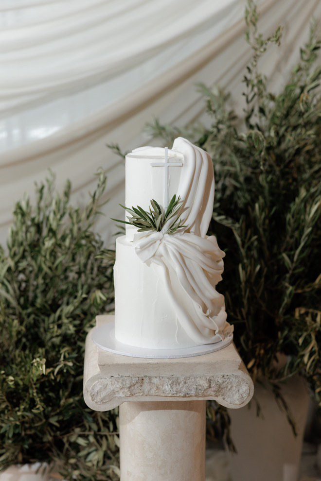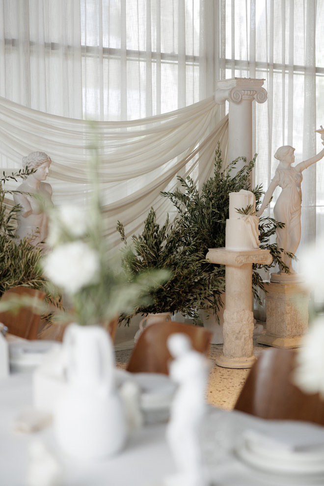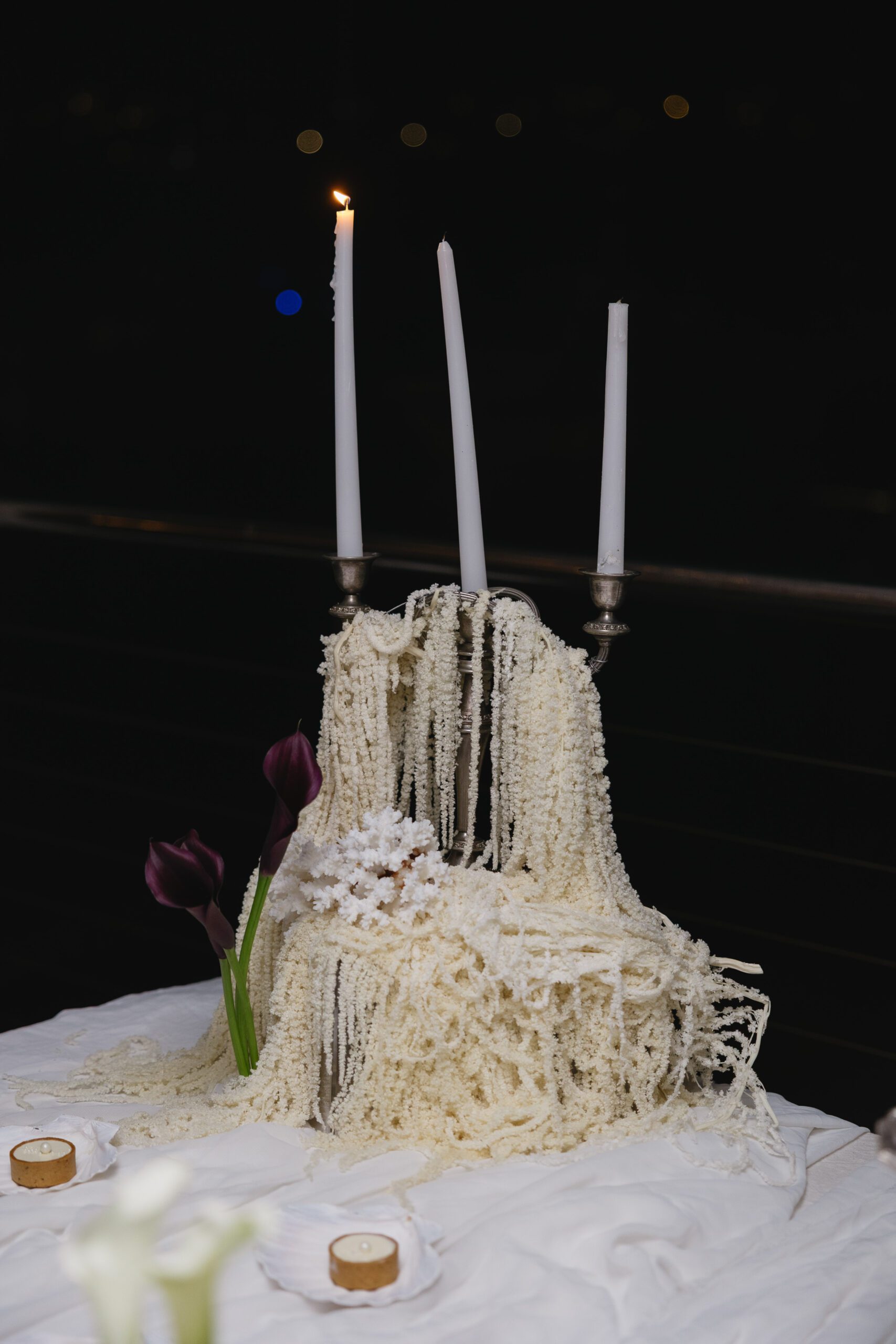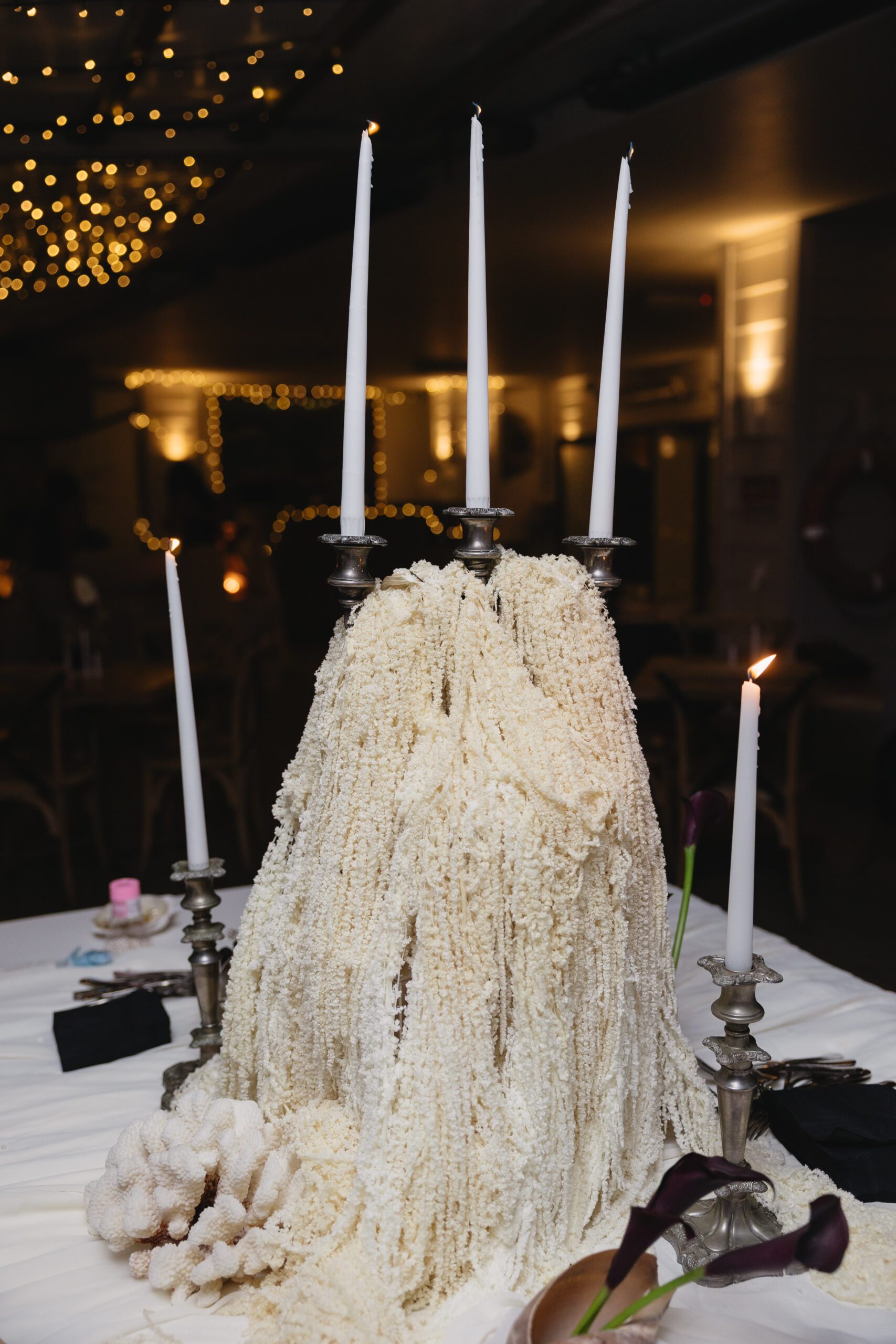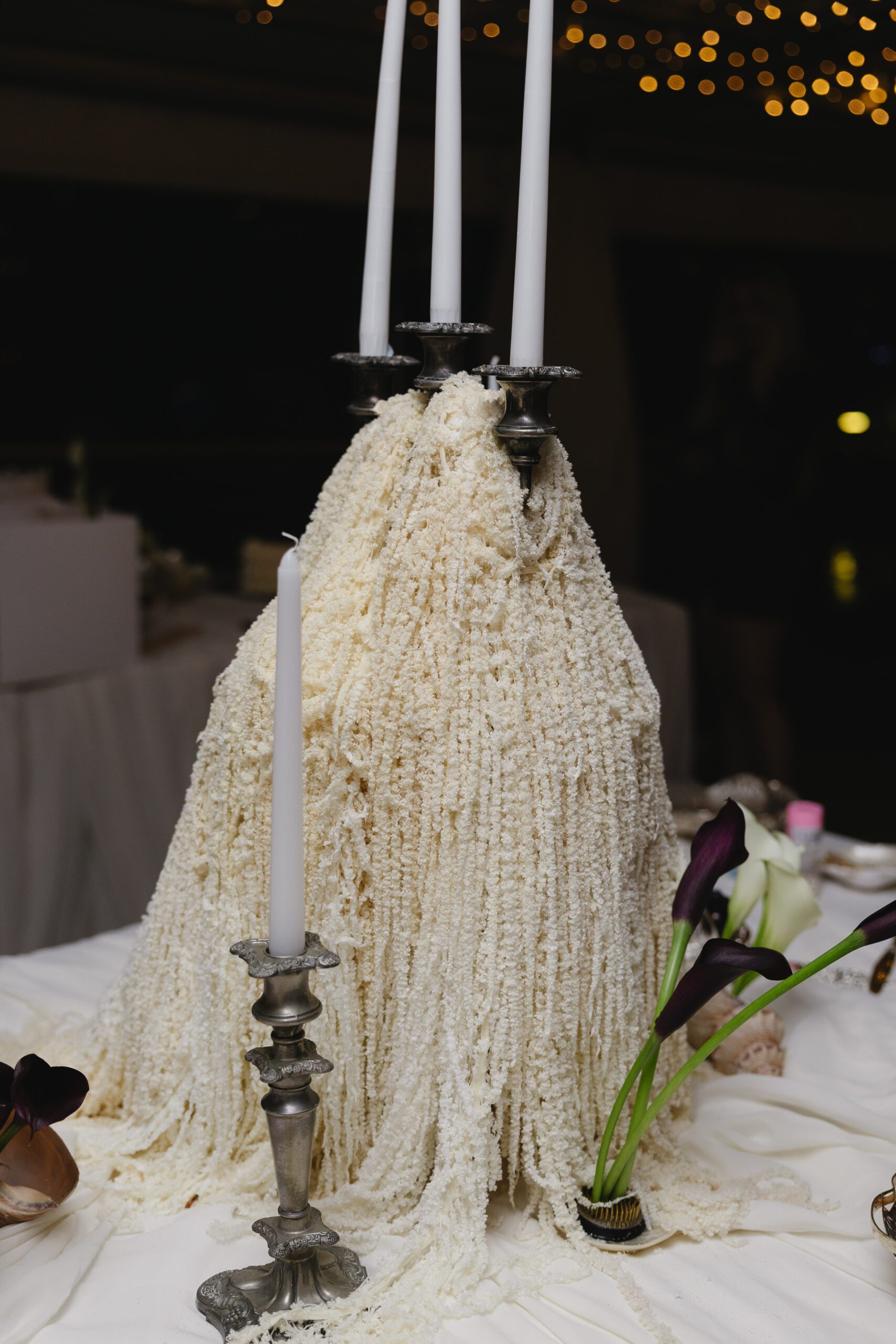 The cake table featured our silk arrangement and parallel to this setting was the gift table where we styled the setting with our premium faux candles and cheesecloth.