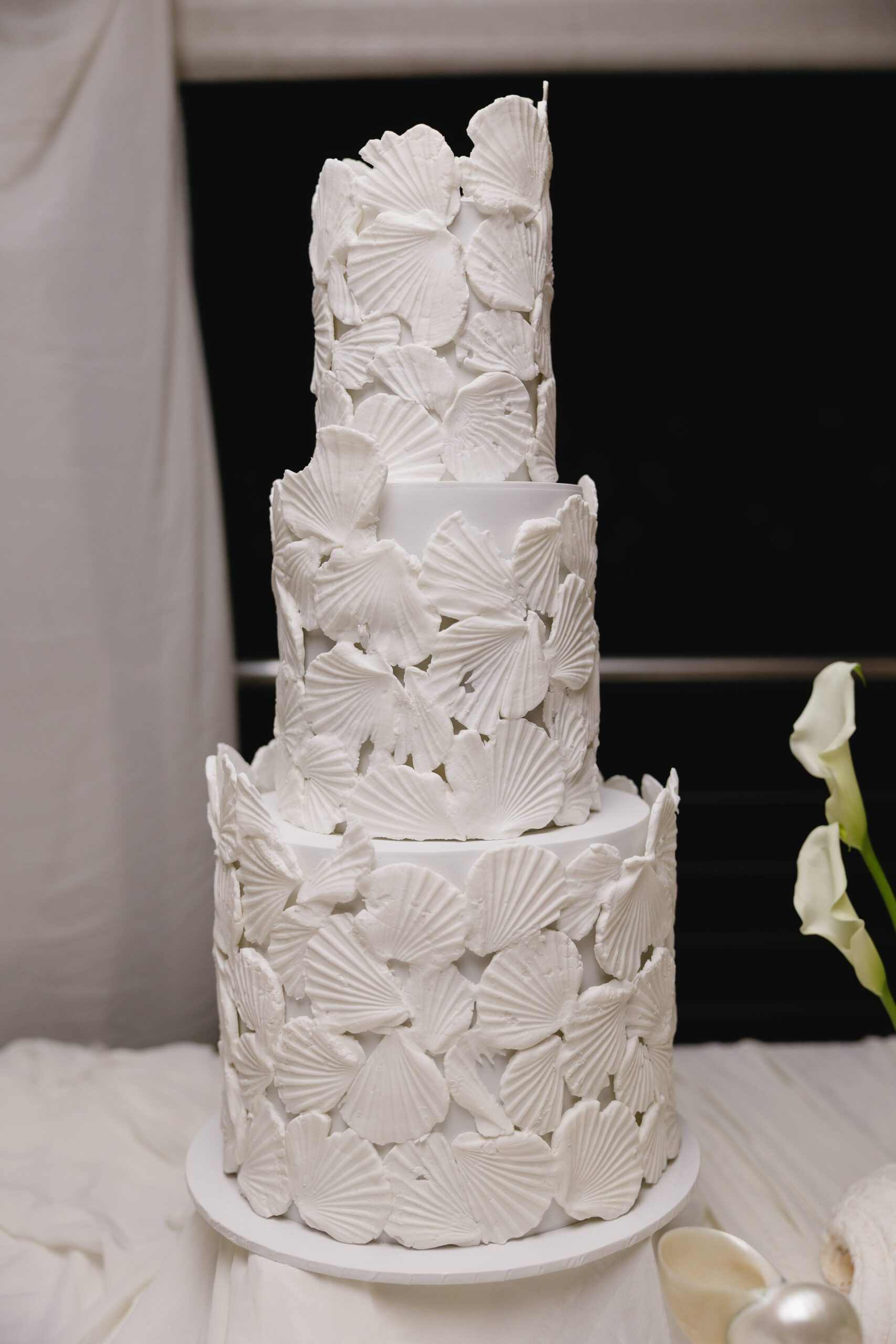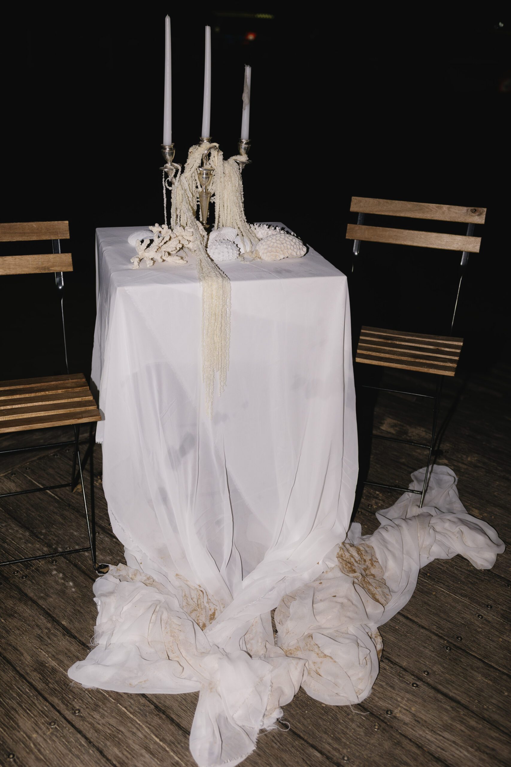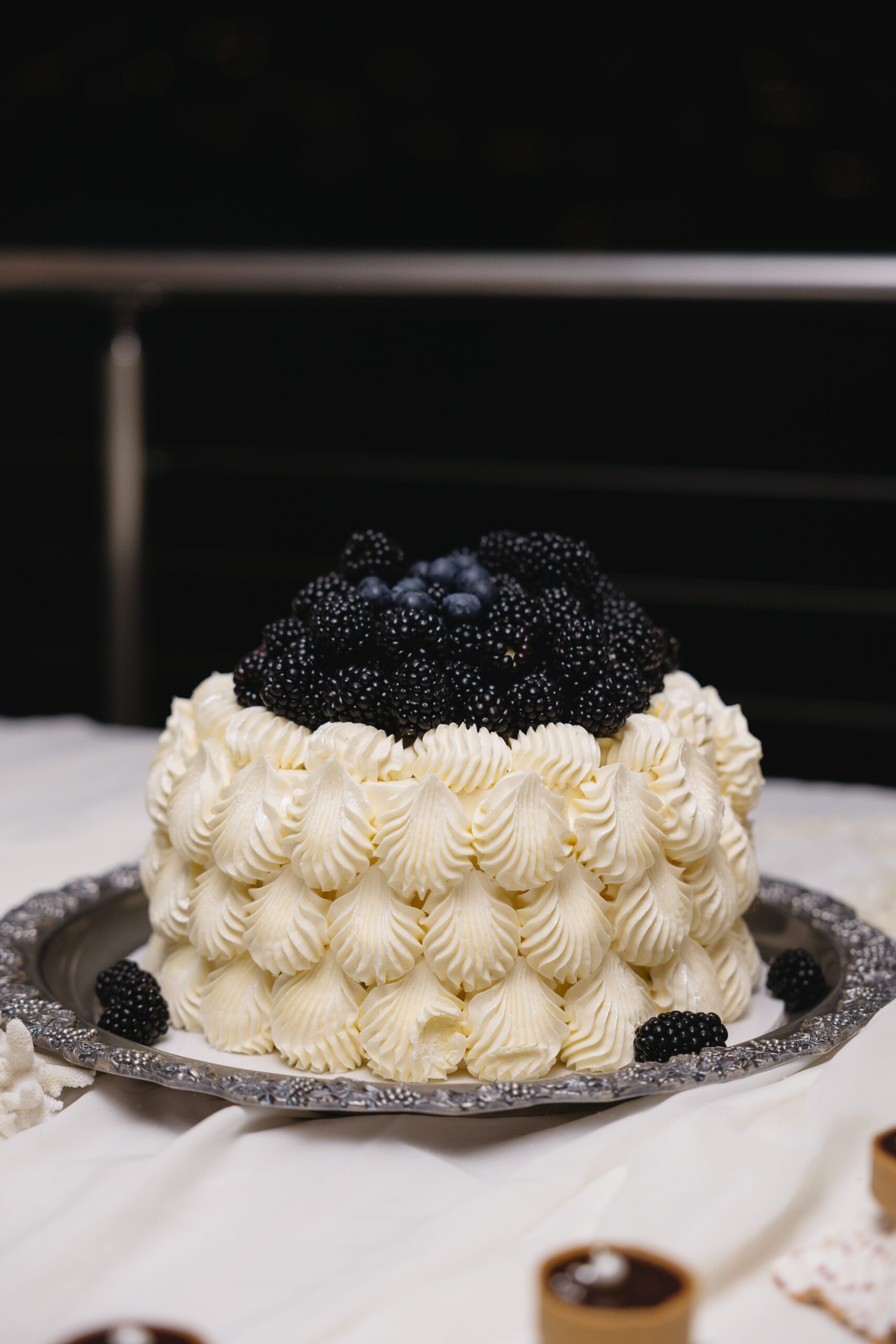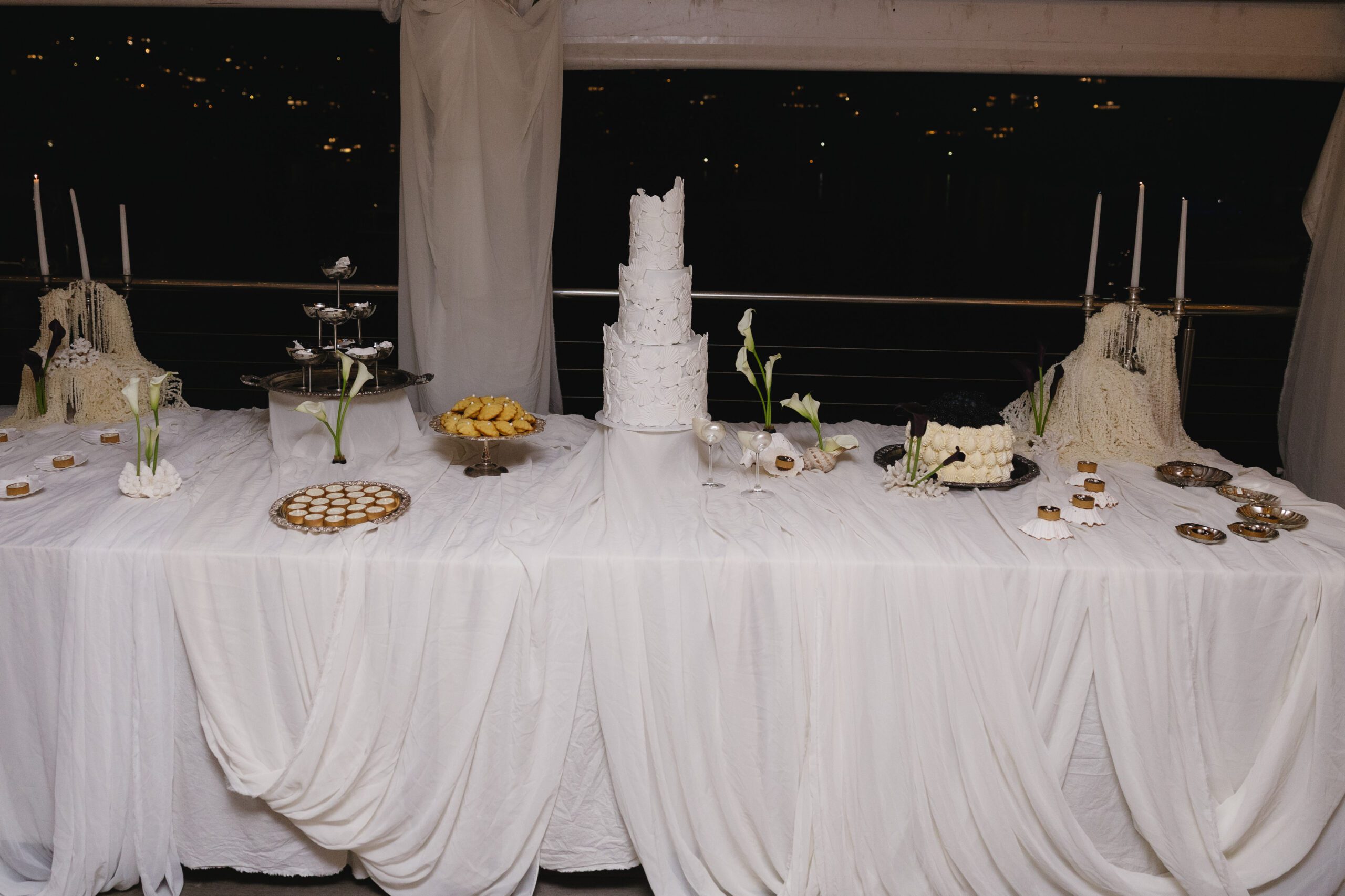The cake table featured our silk arrangement and parallel to this setting was the gift table where we styled the setting with our premium faux candles and cheesecloth.