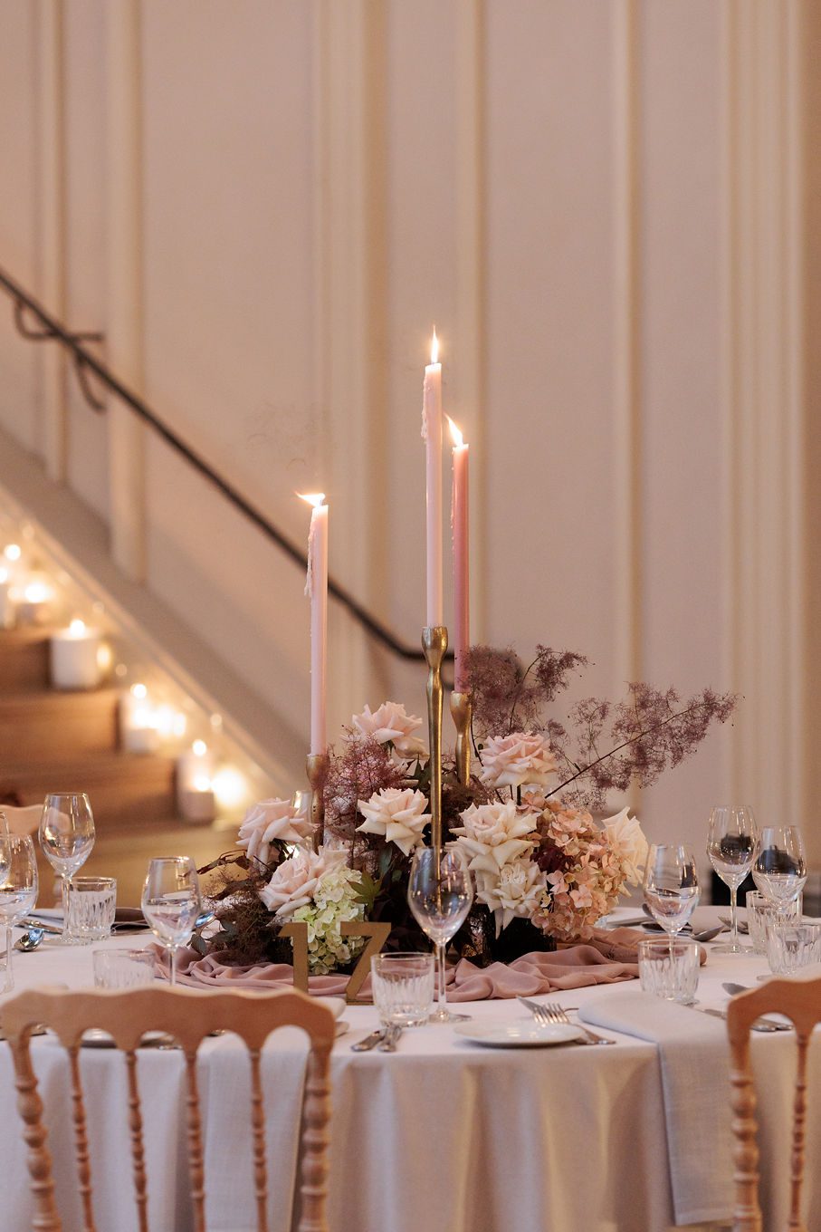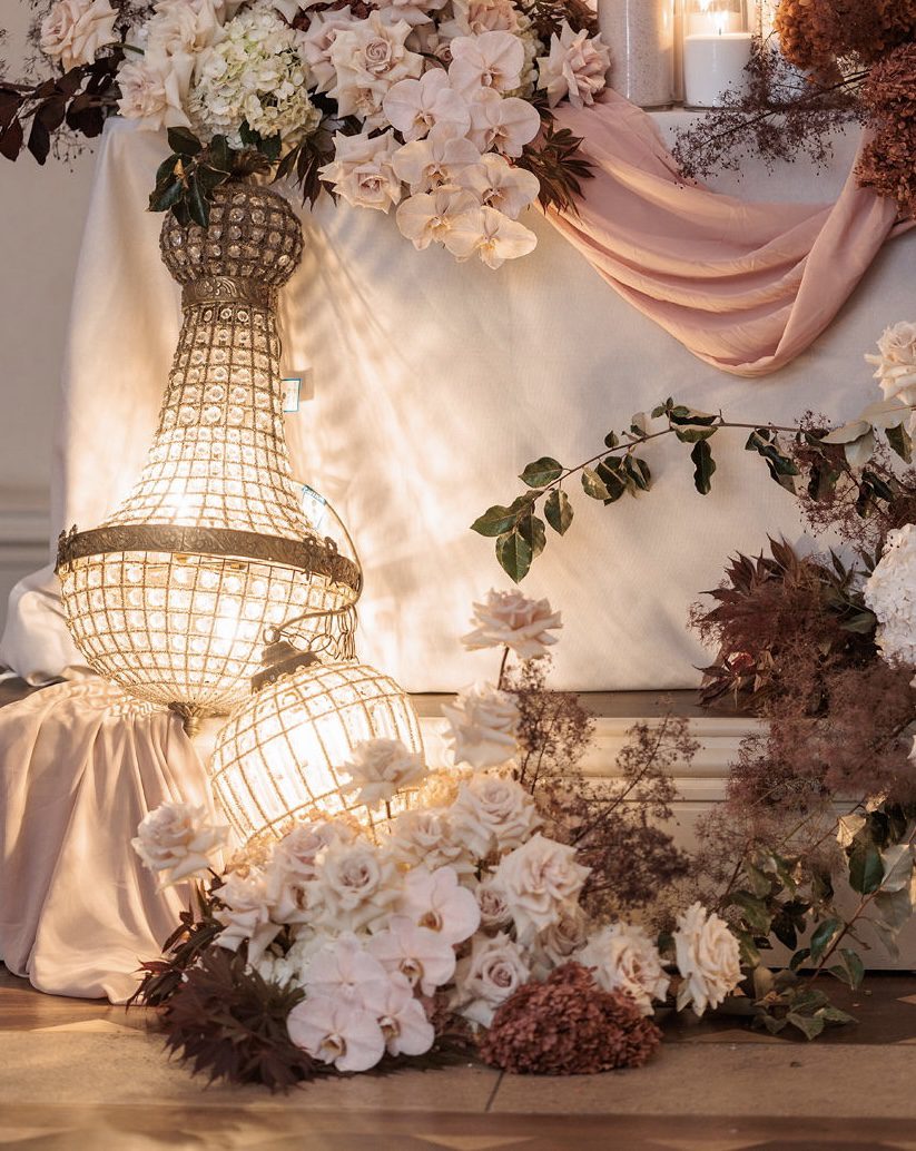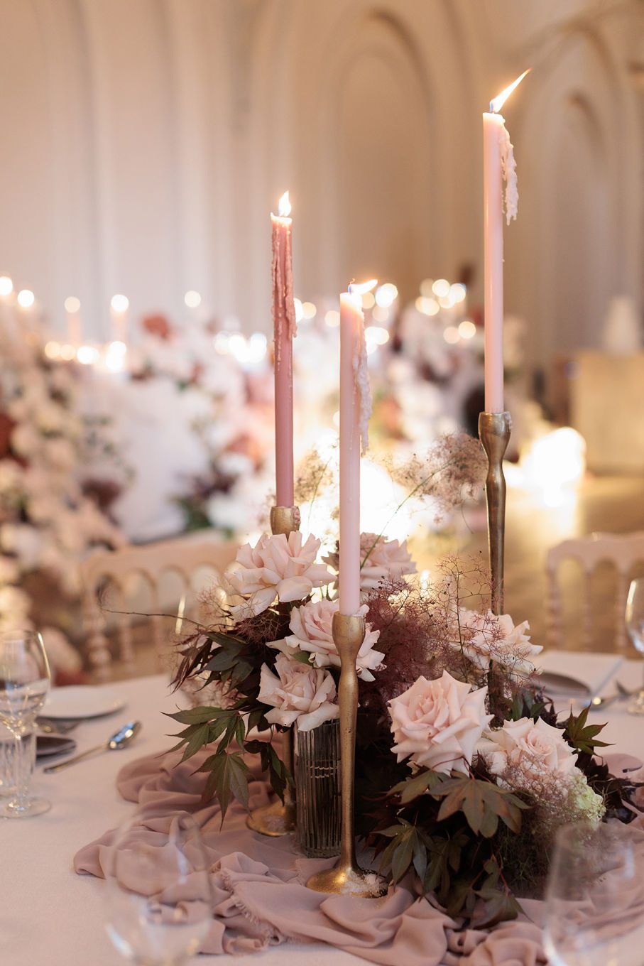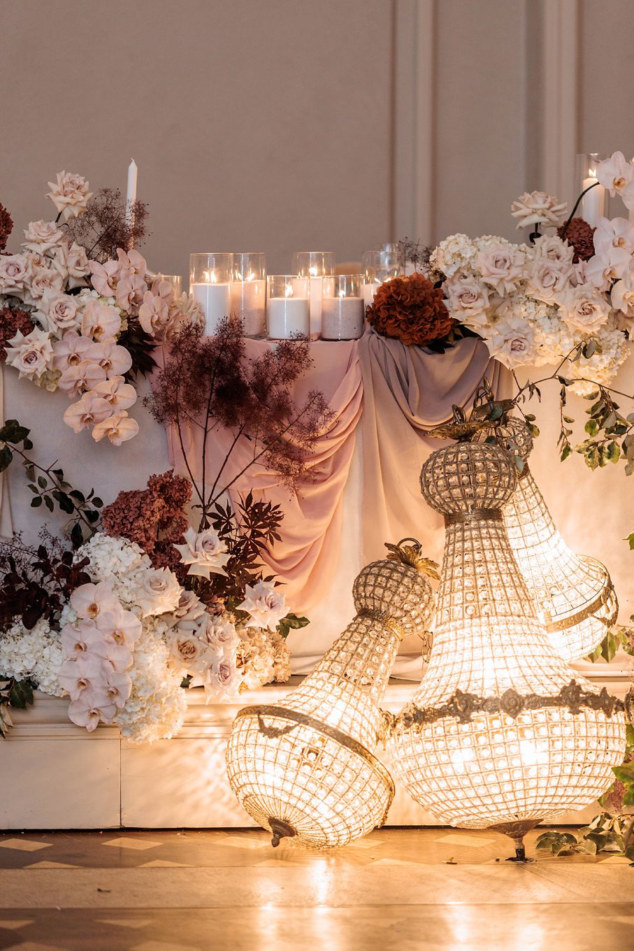 The banquet tables were styled with real touch florals and crystal candle sticks.